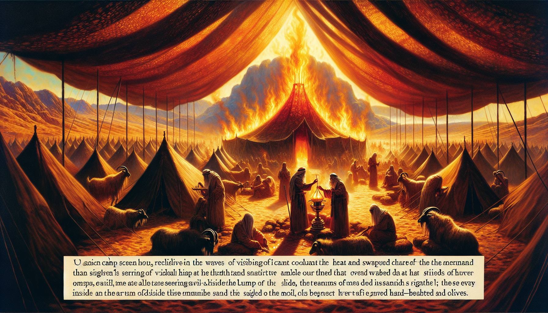 La chaleur de l’après-midi pesait sur le camp, une chaleur de poussière et de soleil cru. Devant la Tente de la Rencontre, l’ombre était rare, et l’air vibrait de silence. À l’intérieur, dans le lieu saint, Aaron accomplissait la tâche…