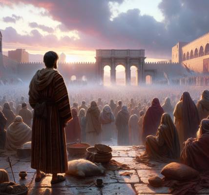 Le soleil se levait à peine sur Jérusalem, teintant les murs de la ville sainte d’une lueur dorée. Les rues commençaient à s’animer : marchands disposant leurs étals, prêts à accueillir les premiers clients ; pèlerins fatigués par leur voyage, cherchant un endroit pour se reposer ; et les prêtres, vêtus de leurs habits sacrés, se dirigeant vers le Temple pour les offrandes du matin. Pourtant, malgré cette apparence de piété, une ombre pesait sur le cœur du peuple.