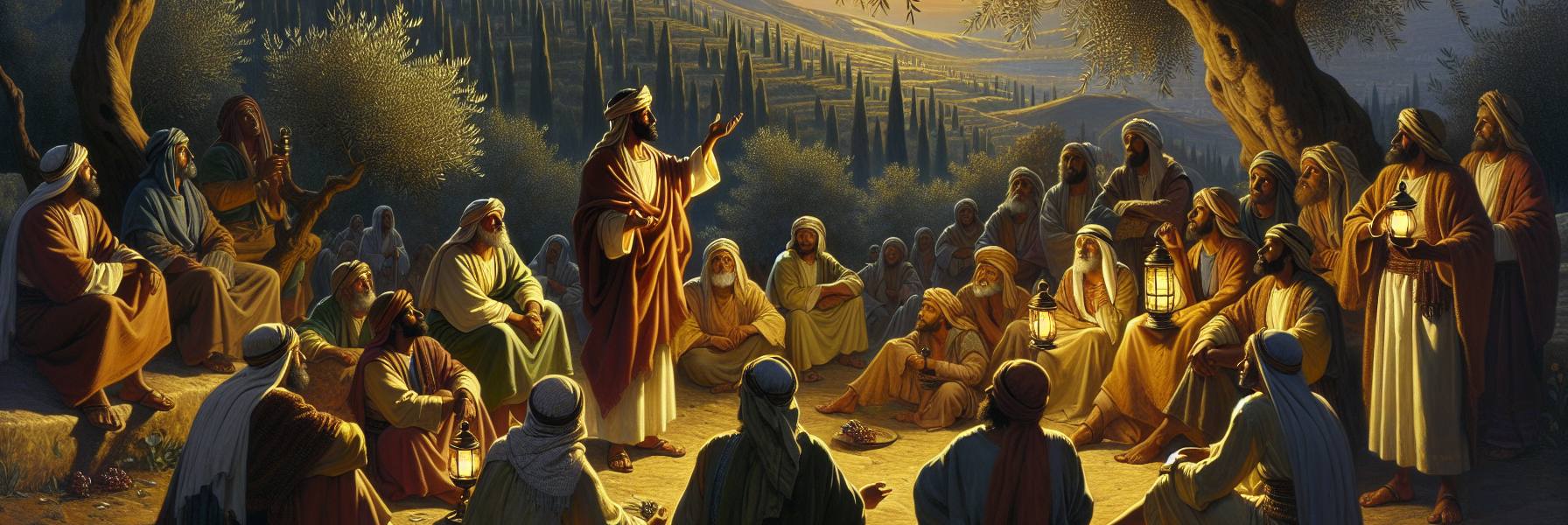 Le soleil commençait à décliner derrière les collines de Judée, projetant de longues ombres violettes sur les sentiers poussiéreux. Jésus s’était assis sur un rocher plat près du Mont des Oliviers, entouré de ses disciples dont les visages étaient tournés vers lui avec une attention intense. L’air était chargé d’un mystère solennel, car le Maître parlait des temps à venir.
