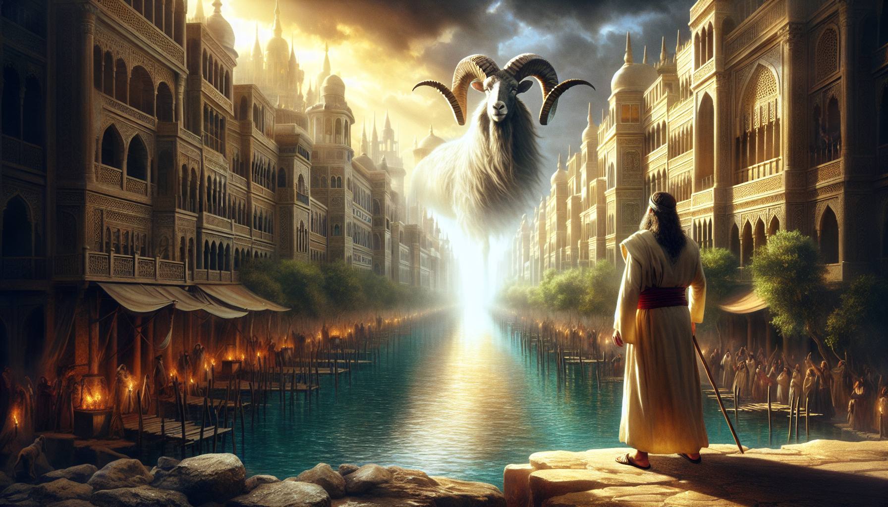 Au temps du roi Belschatsar de Babylone, une vision se dévoila à moi, Daniel, près du fleuve Oulaï. Je levai les yeux et contemplai un spectacle qui glaça mon âme. Je vis d’abord un bélier se tenant devant le fleuve….