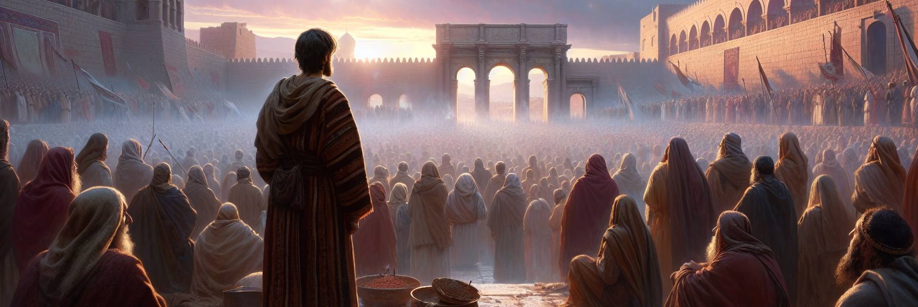 L’après-midi déclina. Le parvis devint un lieu de chaleur dorée, puis d’ombres bleutées. Le peuple commençait à affluer pour les fêtes, par les portes nord et sud, selon les jours ordinaires. Éliakim les observait de son banc de pierre. Des familles avec des paniers, des hommes discutant à voix basse. Ils venaient apporter leurs propres offrandes, selon leurs moyens. La loi était claire : le prince devait donner une mesure égale pour tous aux grandes fêtes, pour les holocaustes et les sacrifices de paix. Pas de distinction entre le riche et le pauvre dans la grâce reçue. La générosité du prince était un canal, pas une faveur.