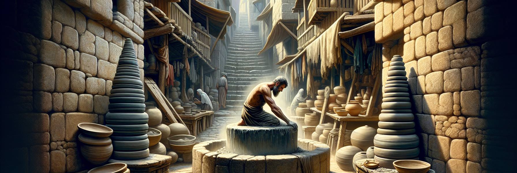 L’air était lourd, chargé de l’odeur tenace de la poussière et de l’argile humide. Jérémie avançait d’un pas lent dans la rue étroite, les pieds soulevant de petites touffes de terre séchée. Le soleil de la mi-journée tapait dur sur Jérusalem, mais ici, dans le quartier des potiers, près de la porte de la Vallée, une fraîcheur relative émanait des ateliers sombres. Le prophète n’était pas venu par hasard. Une parole, lancinante, s’était imposée à lui au petit matin, une de ces paroles qui ne laissent pas de répit : « Lève-toi et descends à la maison du potier. Là, je te ferai entendre mes paroles. »