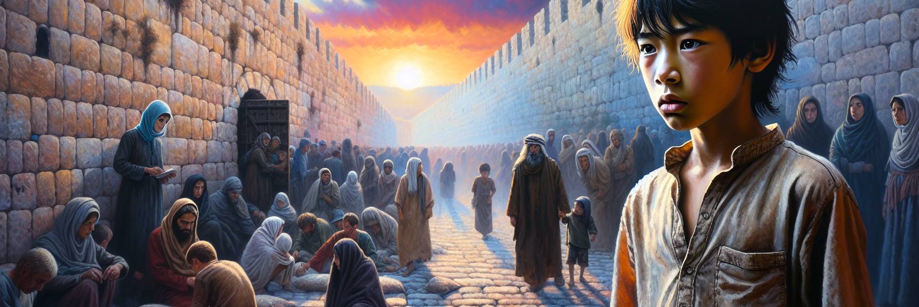 Il venait. Seul. Des sentiers de Bosra, Il avançait, et ses vêtements n’étaient pas ceux d’un voyageur, mais d’un homme revenant du travail le plus terrible. Une tunique teinte, trempée, non pas du violet des rois, mais d’un rouge sombre, profond, qui buvait la lumière du soir. À chaque pas, la couleur semblait chuchoter une histoire de violence et d’achèvement.