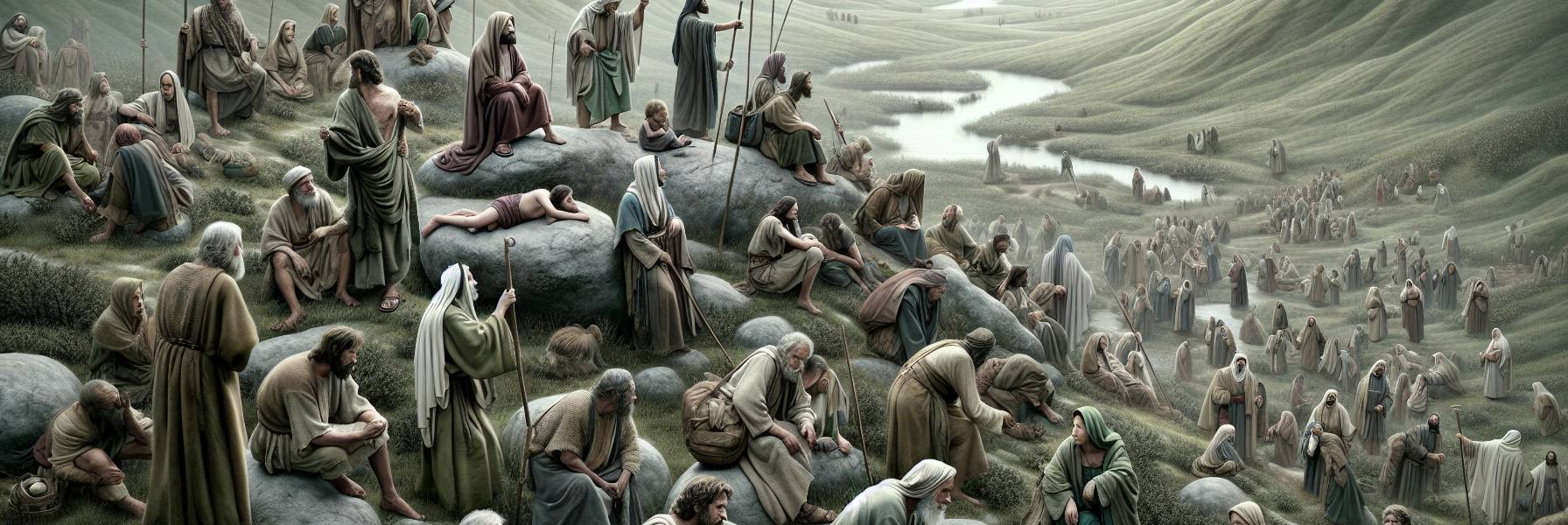 Jésus s’était assis sur une pierre plate, légèrement en surplomb. Il ne parla pas tout de suite. Ses yeux parcoururent les visages levés vers lui, non comme un juge, mais comme quelqu’un qui reconnaît une douleur familière. Il vit la fatigue dans les épaules du laboureur, l’amertume rentrée de l’artisan ruiné par les taxes, la honte silencieuse de la femme dont tout le monde chuchotait le nom. Le silence se fit, peu à peu, troublé seulement par le bêlement lointain d’une chèvre.