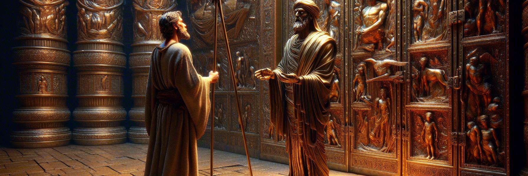L’homme qui se tenait à mes côtés – sa présence était devenue aussi familière que l’étrangeté des visions – tenait à la main une corde de lin. Son visage était grave, mais ses yeux brillaient d’une curiosité tranquille. Sans un mot, il passa la porte orientale et je le suivis. L’eau, devant nous, fuyait le parvis, se glissant vers le soleil levant.