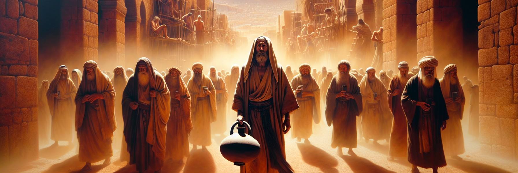 Le poids du vase était familier entre ses mains, une argile rude et poreuse, encore tiède des dernières braises de l’atelier du potier. Jérémie le sentait, ce poids, bien au-delà de celui de la terre cuite. C’était le poids des paroles qui brûlaient sa gorge, un feu comprimé qui cherchait à sortir. Le jour était lourd, un de ces jours où la lumière de Jérusalem semble faite de cuivre en fusion, écrasant les ombres et alourdissant les pas.