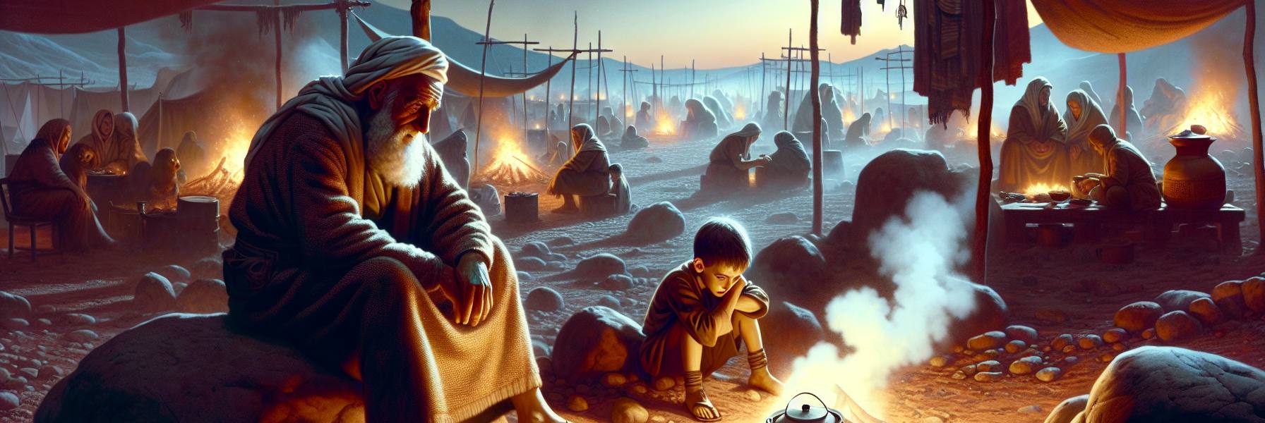 Le vieux Lévite se tenait à l’entrée de sa tente, les yeux perdus vers les collines de Moab qui se teintaient d’or et de pourpre dans la lumière déclinante. L’air sentait la poussière chaude et l’herbe rare, une odeur de nomade, une odeur d’attente. Dans ses mains ridées, usées par les ans et les rouleaux de la Loi, il tenait un morceau de tissu grossier. Il le frottait doucement, comme pour en extraire une parole, un murmure. Ce soir, il devait parler. La communauté était là, campée autour du Tabernacle, et les questions des jeunes hommes montaient avec la fumée des feux.