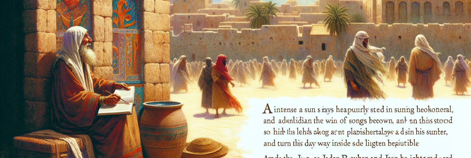 La chaleur de Jérusalem, en cette fin d’après-midi, était lourde et poussiéreuse. Asaph remonta le pan de son manteau sur sa bouche, tentant d’échapper à l’âcre odeur des ruelles où se mêlaient les parfums d’épices, la sueur des bêtes et la fumée des foyers. Il marchait sans but précis, les sandales soulevant de petits nuages ocre. En lui, cependant, brûlait un feu bien plus intense que celui du soleil.