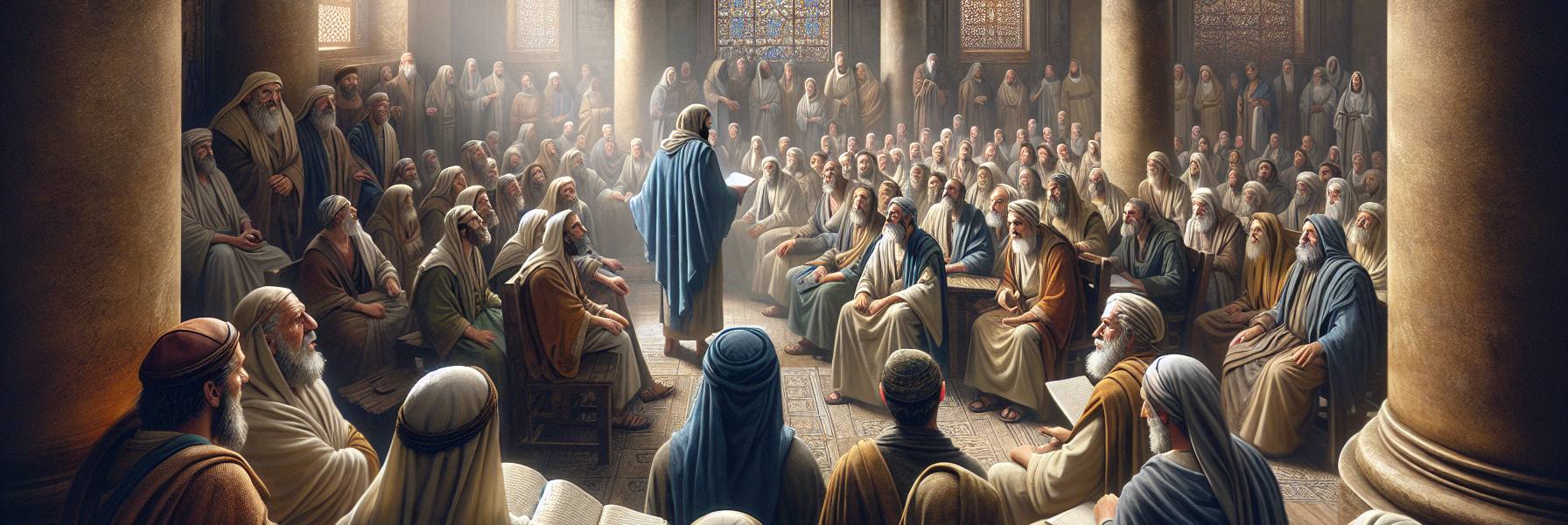 La chaleur, déjà lourde, descendait sur Antioche de Pisidie comme un manteau de laine. Sous le portique de la synagogue, l’ombre était maigre, striée de lumière vive où dansait la poussière du chemin. Saul de Tarse respira profondément, l’air sentant le pin sec et la pierre chaude. À ses côtés, Barnabas, silencieux, observait les hommes qui arrivaient, visages burinés par le soleil ou l’étude, tuniques modestes. Ils étaient venus de loin, certains, attirés par la rumeur de ces étrangers qui parlaient avec un feu singulier.