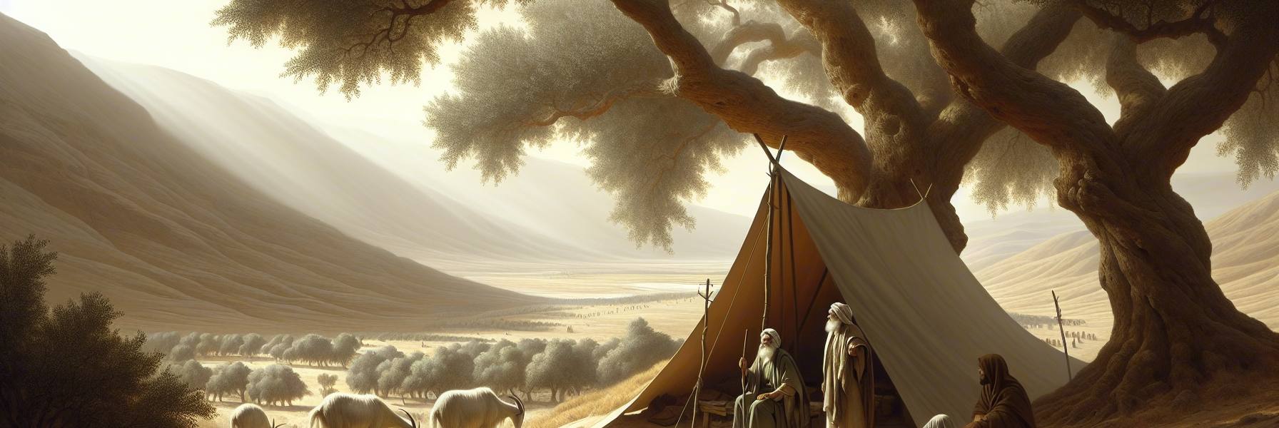 La chaleur de l’heure était à son comble. Elle pesait sur les collines de Mamré, alourdissant l’air, estompant les contours des chênes sous une lumière blonde et poussiéreuse. Abraham était assis à l’entrée de sa tente, cherchant en vain un souffle. La terre elle-même semblait retenir son haleine. Son regard, vague, parcourait l’étendue vallonnée, quand soudain, il tressaillit. Trois formes se dessinaient dans le lointain, immobiles sur le sentier. Elles n’avaient pas l’allure erratique des marchands, ni la hâte des voyageurs. Elles se tenaient là, comme posées depuis toujours au bord de sa vision.