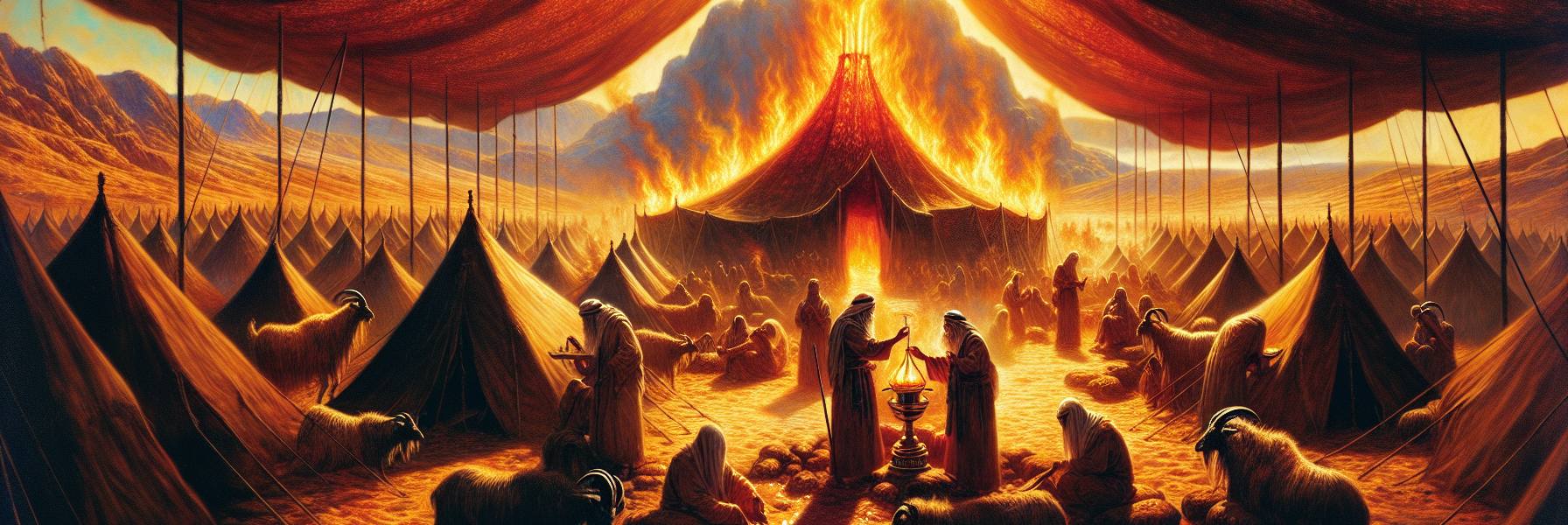 La chaleur de l’après-midi pesait sur le camp, une chaleur de poussière et de soleil cru. Devant la Tente de la Rencontre, l’ombre était rare, et l’air vibrait de silence. À l’intérieur, dans le lieu saint, Aaron accomplissait la tâche avec une lenteur sacrée. Ses mains, marquées par les années, tremblaient un peu en versant l’huile d’olive pure dans les coupes des lampes du chandelier d’or. Une odeur douce et tenace emplissait l’espace, mêlée à celle, plus discrète, de l’encens.