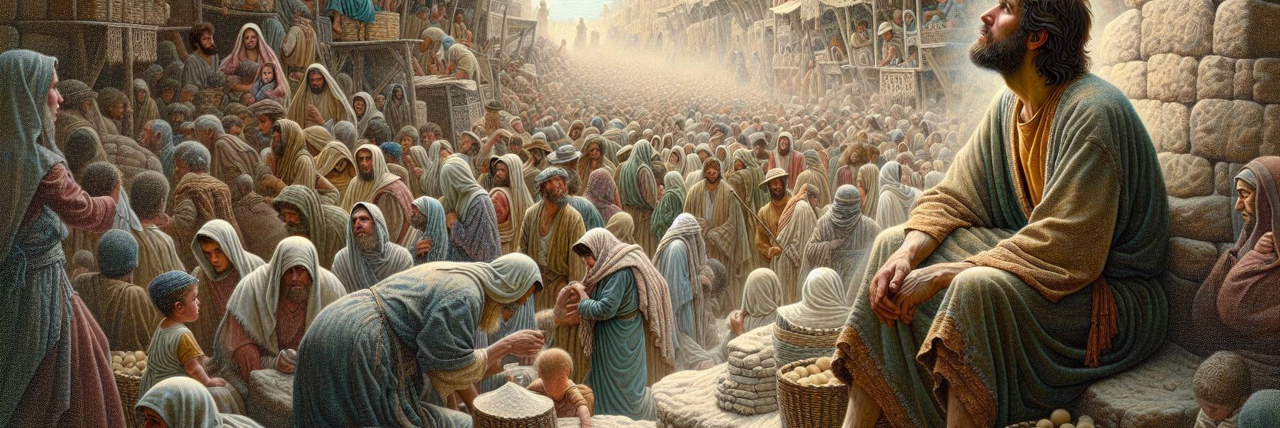 La foule s’était massée sur une pente douce, près du lac. Des familles entières, des pêcheurs encore l’odeur de poisson sur eux, des marchands, quelques soldats romains à l’écart, l’air vaguement ennuyé. Jésus était assis sur une grosse pierre, un peu plus haut. Sa voix n’était pas tonitruante, mais elle portait, claire et posée, traversant le bourdonnement des insectes et les chuchotements.