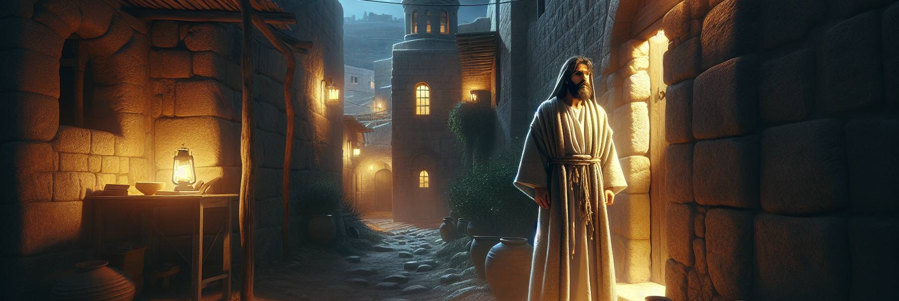 La chaleur du jour tombait lentement sur Jérusalem, une chaleur lourde, poussiéreuse, qui collait aux vêtements. Dans les ruelles, l’ombre s’allongeait, bleuissant les pierres. Nicodème sentait cette chaleur quitter ses épaules comme un manteau trop lourd, mais une autre tension, plus sourde, demeurait en lui. Il attendit que les dernières lueurs du couchant aient cédé la place à un ciel épais, constellé. Ce n’était pas la peur, se disait-il. Un homme de son rang, un pharisien, membre du Sanhédrin, ne craignait pas. C’était… de la prudence. Une prudence mêlée d’une curiosité qui le rongeait depuis des jours, depuis qu’il avait entendu les récits, depuis qu’il avait vu les regards transformés des gens du petit peuple.