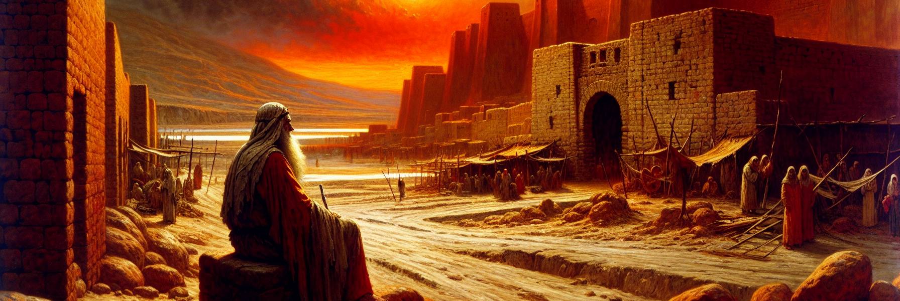 Le soir tombait sur Sodome, et avec lui, une chaleur lourde, épaisse comme de l’huile. L’air sentait la poussière chaude, le fumier des troupeaux rentrés, et cette autre odeur, plus sourde, qui semblait toujours monter des ruelles : celle du vin renversé, des parfums trop forts, et d’une sueur nerveuse, collective. Lot était assis sur un banc de pierre à la porte de la ville, comme il le faisait souvent. Ce n’était pas un lieu de repos, mais de vigilance. Il scrutait la route qui venait de la plaine, les yeux plissés contre la lumière basse du soleil couchant. Son cœur, ces derniers temps, était un poids dans sa poitrine.