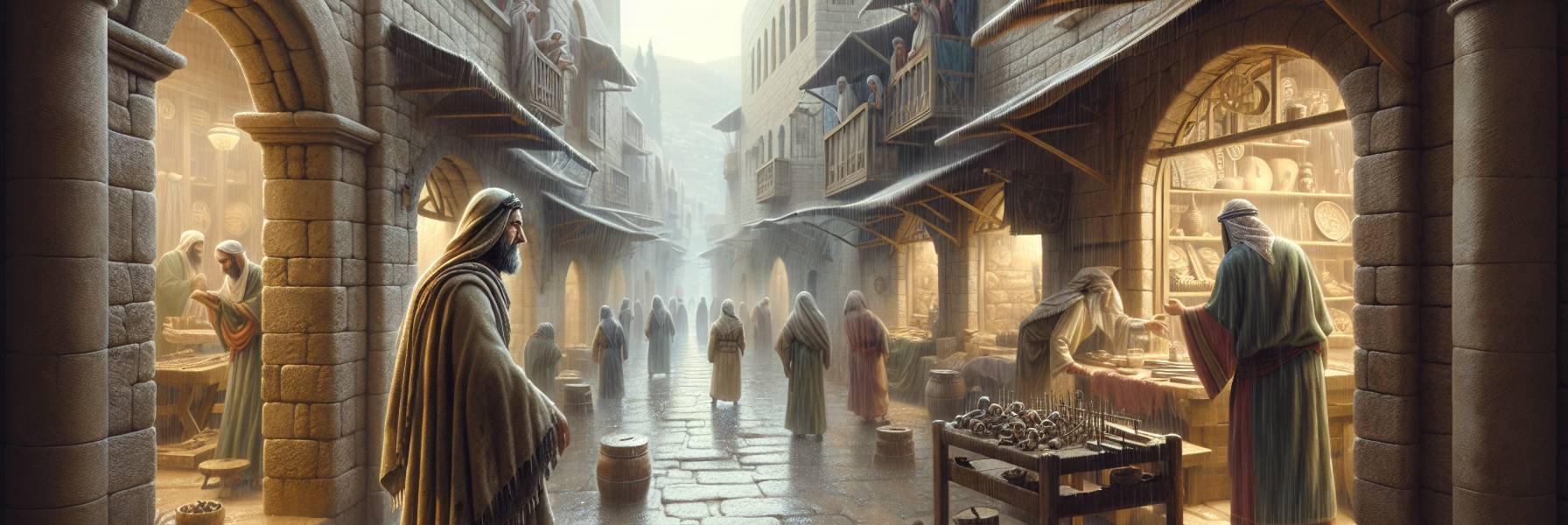 Le vent d’est apportait avec lui une odeur de bois résineux et de métal chauffé. Cela venait du quartier des artisans, derrière la porte de la Vallée. Jérémie, les pieds poussiéreux, s’était arrêté à l’ombre d’un mur de pierre, écoutant le concert familier des marteaux et des scies. Ce n’était pas la curiosité qui l’y avait conduit, mais une pesanteur au crein de l’âme, une nécessité de voir de ses yeux ce dont l’Éternel lui parlait dans le silence de son cœur.