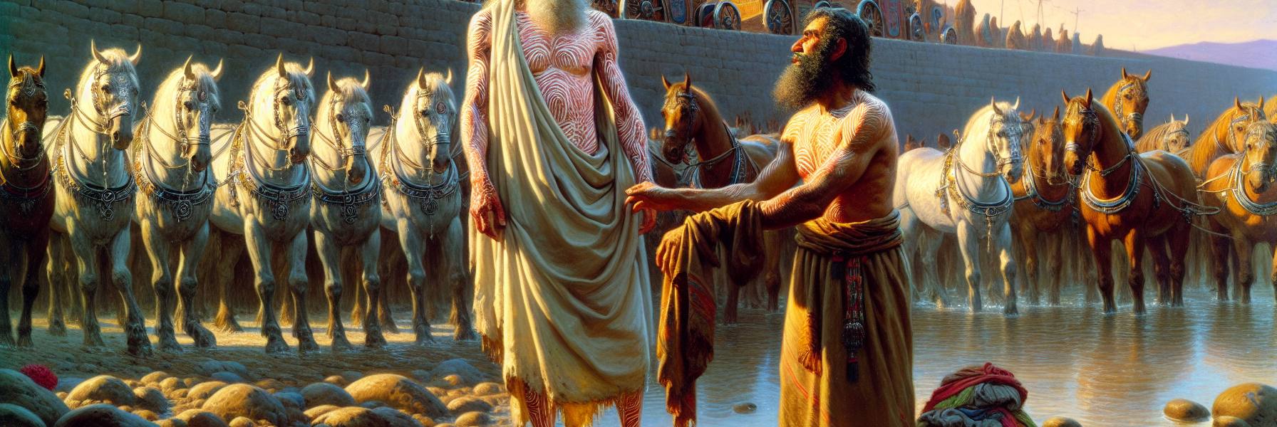 Naaman, avec tout son attirail, ses chevaux qui piaffaient d’impatience, s’arrêta devant la porte de la maison d’Élisée. Il s’attendait à une cérémonie, à des incantations, à l’imposition des mains. Il attendit. Le battant de bois resta clos. Un serviteur sortit enfin, un jeune homme au visage sérieux. Il ne s’inclina même pas profondément.
