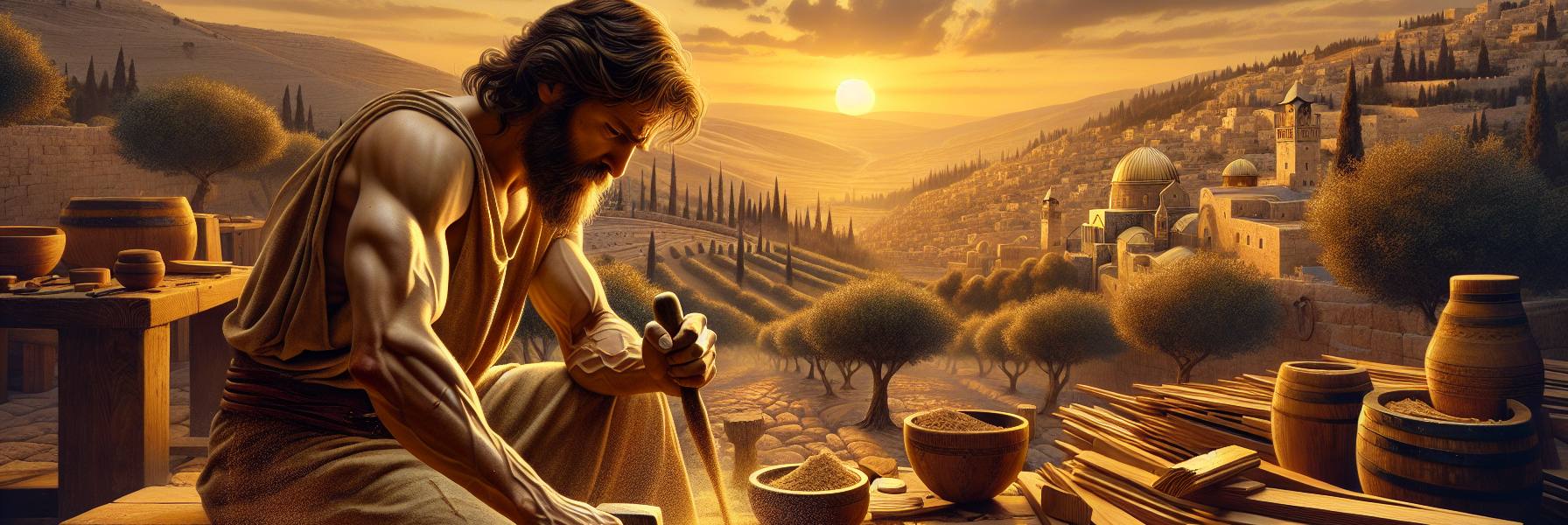 Le jour se levait sur Jérusalem avec une lenteur d’ambre. Une frange pâle, puis orangée, déchira l’obscurité au-dessus du mont des Oliviers, et la lumière se mit à couler le long des ruelles en pente, cherchant les seuils des maisons de pierre. Dans l’atelier de Yohanan, l’air était déjà dense, saturé de l’odeur du cèdre et du cyprès, une senteur de résine et de poussière de bois qui collait à la peau. Il était debout depuis longtemps, ses mains calleuses parcourant le grain d’une poutre, évaluant sa force, sa droiture. Le travail du bois était un dialogue. Il fallait écouter ce que la matière disait, plier sans casser, tailler avec respect. Ce n’était pas seulement un métier, c’était une manière d’être au monde, droite et utile.